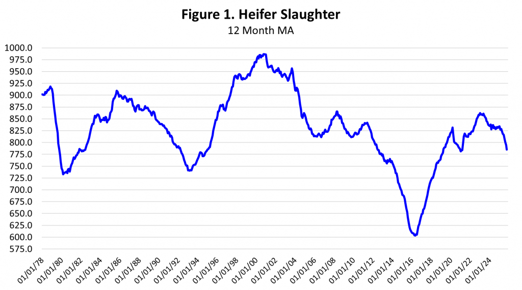 It is true that heifer slaughter is down 6.6 percent so far this year and is falling faster than steer slaughter, which is down 4.4 percent for the year to date. Figure 1 shows average monthly heifer slaughter since January 1978. Average heifer slaughter peaked most recently in January 2023 and has declined 9.0 percent as of October 2025. Heifer slaughter is quite variable and does decrease during periods of herd expansion. However, at this point the decrease in heifer slaughter is not enough to indicate significant heifer retention.