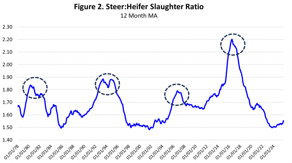Figure 2 shows the ratio of steer to heifer slaughter over the same 49-year period. The obvious spikes in the ratio (dotted circles) correspond to herd expansions in the years 1979-1982; 1990-1996; 2004-2006; and 2014-2019. The ratio increases when heifer slaughter drops relative to steer slaughter during herd rebuilding. The current steer:heifer ratio has begun to increase but appears to indicate only the slightest beginning of heifer retention. Additional heifer retention may build in 2026 but the pace appears to be slow.