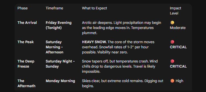 Saturday: This is the window where the “2 feet” potential mentioned by McManus comes into play. The combination of heavy snow and wind will create drifts significantly deeper than the actual snowfall.