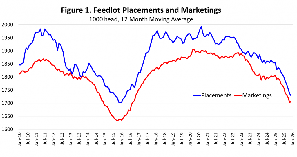 The January Cattle on Feed report showed an on-feed total of 11.45 million head to start the year, down 3.2 percent year over year and the fourteenth consecutive month of declining feedlot inventories. Average feedlot inventories for the past year (twelve-month moving average) are now at the lowest level since September 2018 and are down 3.8 percent from the cyclical peak in September 2022.