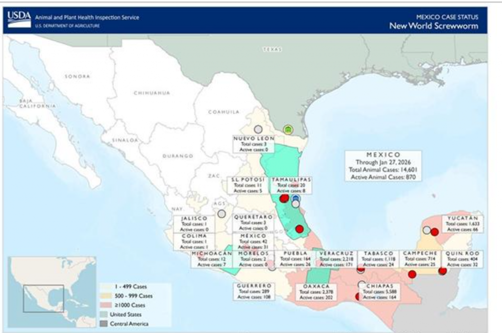 According to USDA, Mexico has 870 active cases involving animals as of Jan. 20, 2026, including eight active cases in the Mexican state of Tamaulipas, which borders Texas. The Centers for Disease Control and Prevention also reports Mexico has 24 people hospitalized after being infected by NWS larvae.