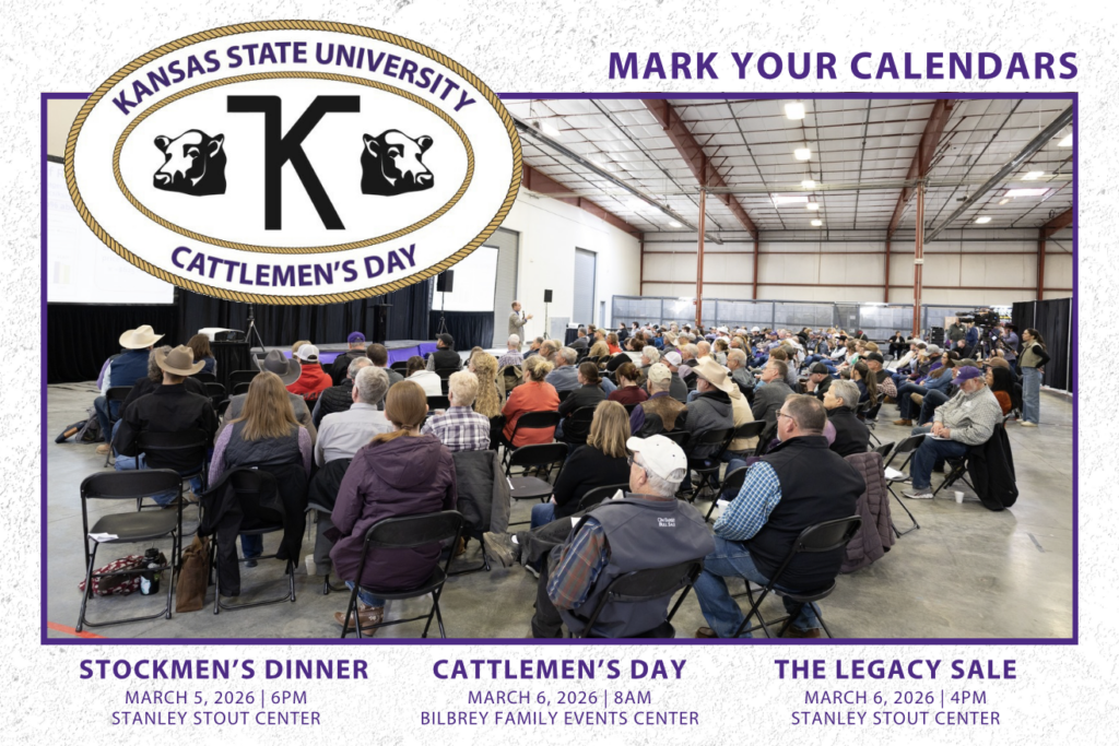 Plan to join us for the 113th Annual Cattlemen’s Day set for Friday, March 6 at the Bilbrey Family Event Center in Manhattan, KS. This year’s program features an economic outlook, presentations on focused selecting the next generation of replacement females, updates on current research and emerging parasitic diseases. An additional highlight is Dr. Shannon Ferrell, of Oklahoma State who will address “Navigating Farm and Ranch Generational Transitions”.