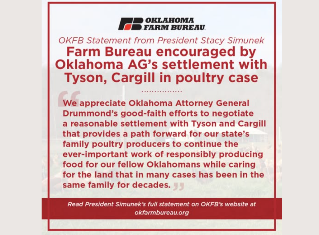 “We appreciate Oklahoma Attorney General Drummond’s good-faith efforts to negotiate a reasonable settlement with Tyson and Cargill that provides a path forward for our state’s family poultry producers to continue their ever-important work of responsibly producing food for our fellow Oklahomans while caring for the land that in many cases has been in the same family for decades. “Our members still have questions and concerns about the settlement’s agreement to a court-appointed Special Master, which would create a burdensome regulatory structure in our state. However, we appreciate the cooperation between the attorney general and the poultry companies to provide certainty to our agricultural producers.”