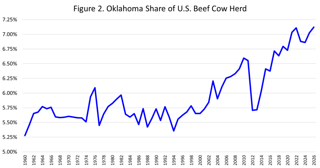 The Oklahoma beef cow herd has been growing relative to the national herd for more than 25 years (Figure 1). Oklahoma currently represents 7.1 percent of the national beef cow herd (Figure 2) and has averaged 6.5 percent for the past 25 years. From the 1960s through the 1990s, Oklahoma averaged 5.7 percent of the national beef cow herd.