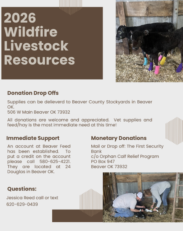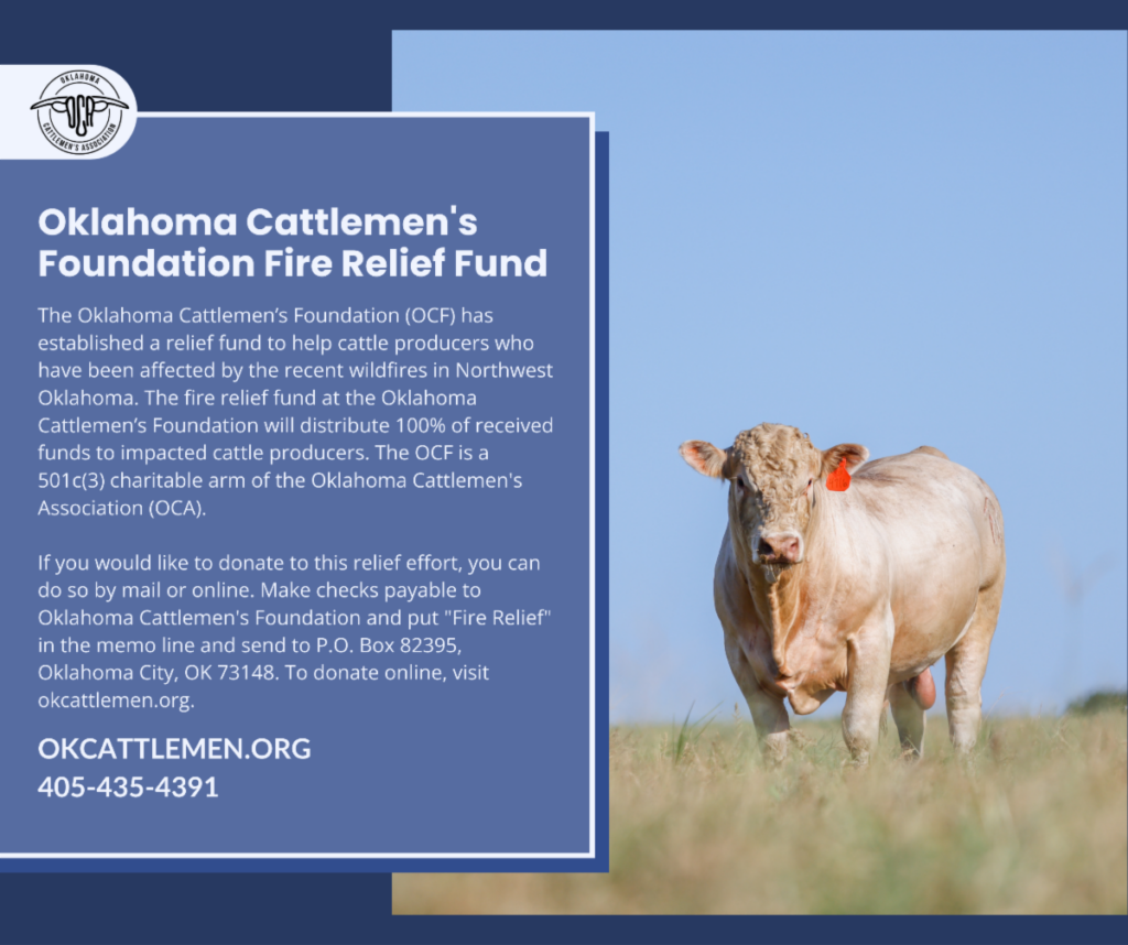 The Oklahoma Cattlemen’s Foundation (OCF) has established a relief fund to help cattle producers who have been affected by the recent wildfires in Northwest Oklahoma. “We are coordinating with boots on the ground leaders in the Panhandle and Northwest to identify ranchers that are in need,” said Michael Kelsey, Executive Vice President of the Oklahoma Cattlemen’s Association. “The wildfire relief fund at the Oklahoma Cattlemen’s Foundation will distribute 100% of received funds to impacted cattle producers. The OCF will establish an application process later this week and encourage impacted producers to let us know the extent of the damage to their cattle operation so we can help directly.”