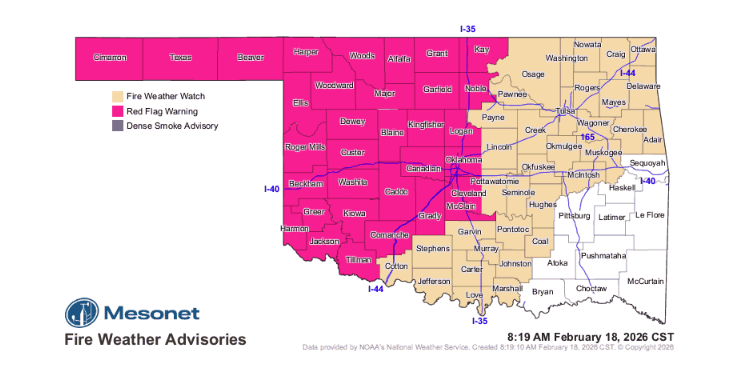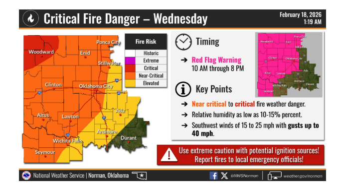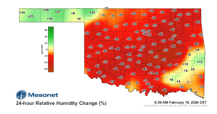 - Central Oklahoma: RH values are expected to drop as low as 14%.