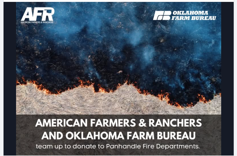 Wildfires have burned significant acreage in the Oklahoma Panhandle in recent days, with impacted land in the region exceeding 300,000 acres. With more high-firedanger days ahead, American Farmers & Ranchers Mutual Insurance Company (AFR Insurance), Oklahoma Farm Bureau (OKFB) and Oklahoma Farm Bureau Insurance have teamed up to help the fire departments working tirelessly to protect lives and property.
