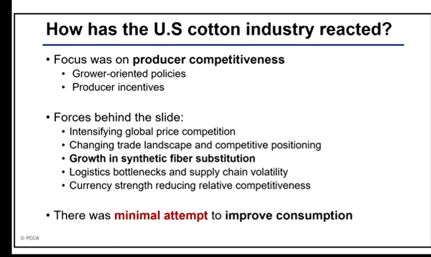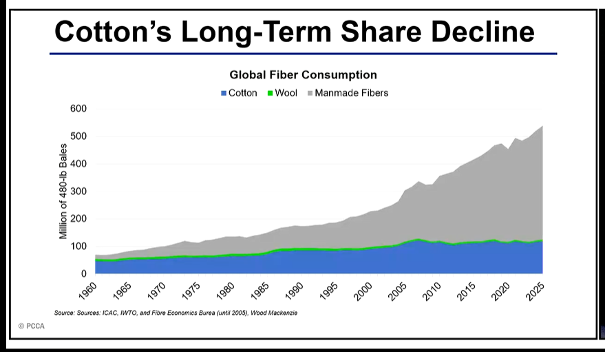 - Price Advantage of Synthetics: Hoelscher notes that cotton hasn’t necessarily become more expensive, but polyester has become significantly cheaper on the global marketplace.