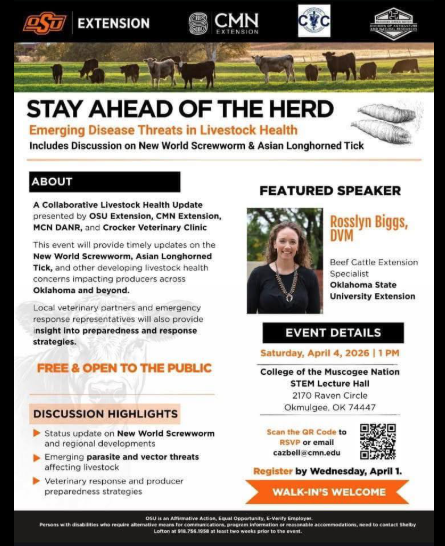 Crocker Veterinary Care is partnering with OSU Extension, CMN Extension, and MCN DANR and to bring you an important update on emerging disease threats in our area — including New World Screwworm and Asian Longhorned Tick. A collaborative effort between OSU Extension, CMN Extension, MCN DANR, and Crocker Veterinary Clinic is bringing a critical livestock health update to Oklahoma producers. The event, titled “Stay Ahead of the Herd,” aims to provide timely information on pressing biosecurity and health concerns currently impacting the region.