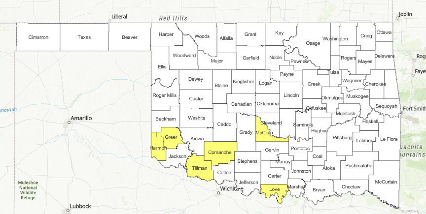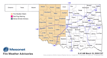 A Fire Weather Watch is currently in effect for Western Oklahoma for Tuesday, where south-southwest winds around 20 mph and low humidity will likely elevate fire danger indices. Officials anticipate this watch may transition into a Red Flag Warning as 1-hour fuel moisture drops to near 3% in western counties.