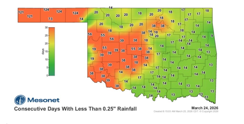 - Evaporation Rates: High winds and low humidity have led to massive evaporation losses. Bare soil temperatures at the 4-inch depth have spiked into the 60s and 70s across central and southern Oklahoma, further drying out the root zone.
