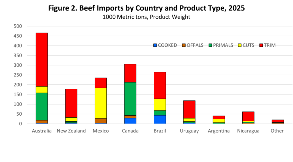 Figure 1 shows that 52 percent of beef imports consist of beef trimmings. Nearly every source of beef imports includes significant proportions of trimmings (Figure 2). Australia was the largest source of beef imports and the largest source of beef trim, accounting for 31.5 percent of imported trim. New Zealand was the number five source of beef imports but the second largest source of beef trimmings (16.7 percent) because 82.2 percent of beef from New Zealand is trimmings. Brazil is the second largest source of imports and accounted for 15.7 percent of imported trimmings. Canada and Uruguay each contributed just under eleven percent of beef trimmings.