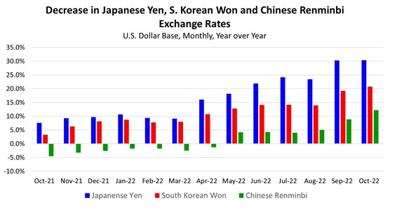 The combination of macroeconomic weakness around the world and U.S. efforts to combat inflation with higher interest rates has resulted in the U.S. dollar strengthening against many currencies. A stronger dollar makes U.S. product exports more expensive and simultaneously makes imports of foreign products more attractive. Figure 1 shows the decrease in the currency exchange rates for the three largest beef exports markets, Japan, South Korea and China/Hong Kong over the last year. The figure shows, for example, that the Japanese Yen has weakened by 30 percent in September and October compared to last year. In other words, one dollar will exchange for 147 Yen in October 2022 compared to 113 Yen one year ago. Similarly, one dollar today buys more South Korean Won and Chinese Yuan compared to last year.