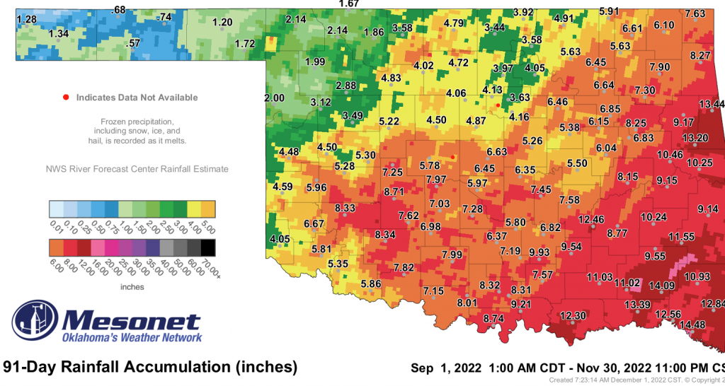 McManus says don’t get your hopes up for snow, though, “There won’t be any snow through the period, even though we’re getting deeper into December. There’s just too much warm-ish air around at the surface and the mid-levels to allow us any frozen fun like that. ” McManus says we will see a couple of cold fronts, the first one tonight, then another mid-week, “The latter of which could produce some freezing rain up in N OK, but not like a huge cataclysmic ice storm since it will still quickly warm up above freezing.”