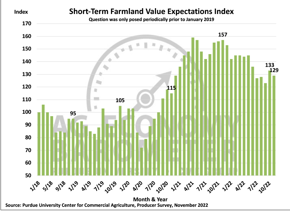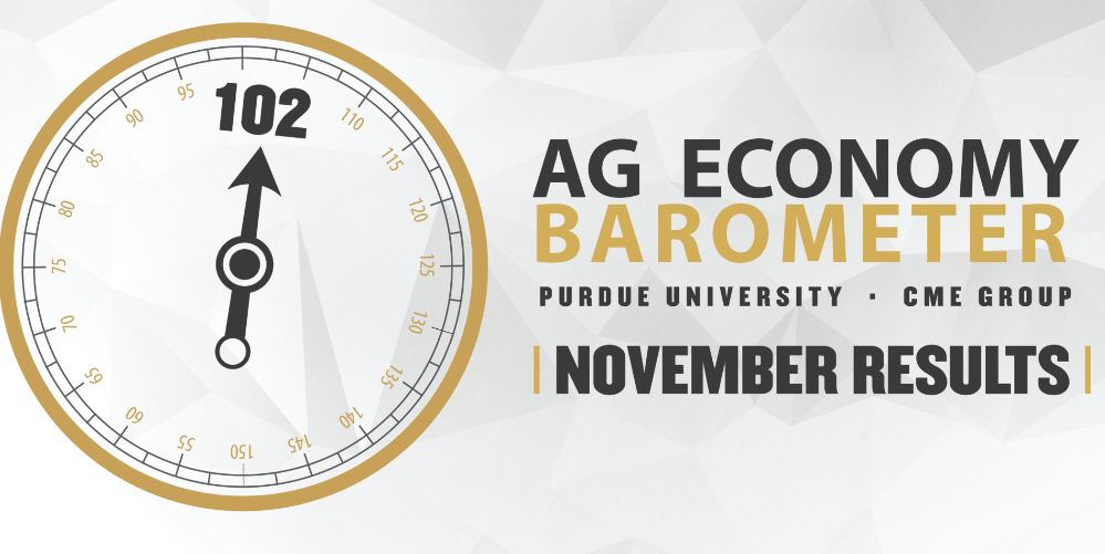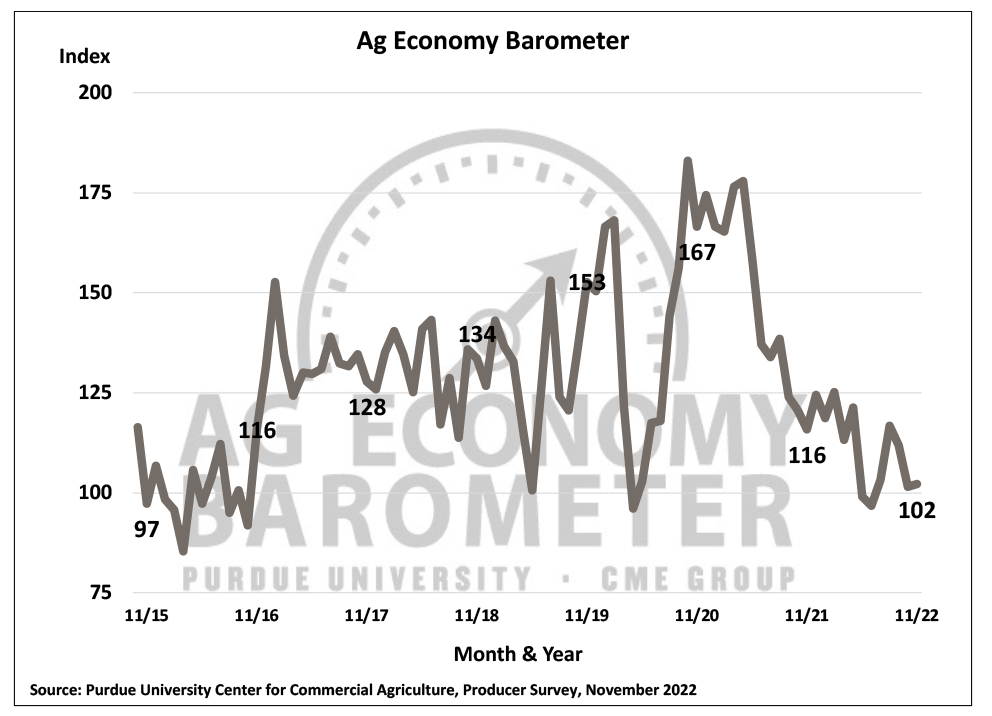 Farmer sentiment was unchanged in November as the Purdue University-CME Group Ag Economy Barometer Index came in at a reading of 102, the same as in October. There was however a slight shift in underlying sentiment as the Index of Current Conditions declined 3 points this month to a reading of 98 while the Index of Future Expectations rose 2 points to 104. This month’s survey was conducted the week following the November U.S. elections but, unlike the period immediately following the two most recent presidential elections, there did not appear to be a noticeable sentiment swing attributable to the election outcomes. The Purdue University-CME Group Ag Economy Barometer sentiment index is calculated each month from 400 U.S. agricultural producers’ responses to a telephone survey. This month’s survey was conducted from November 14-18, 2022.
