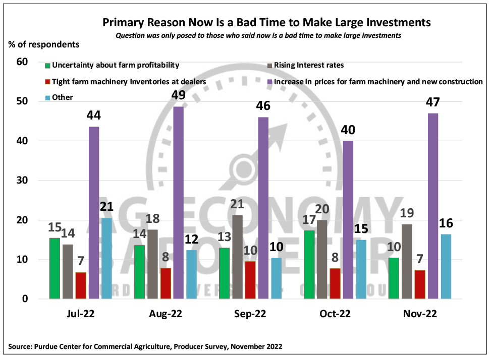 The Farm Capital Investment Index dropped back to its record low of 31 in November. This month’s decline of 7 points pushes the reading back to its September level, erasing the modest rise in the index that took place in October. It’s become increasingly clear that the index is capturing the perception among producers that this is not a good time to make large investments because prices for farm machinery and construction are high. This month just 10% of respondents said now is a “good time” to make large investments while 79% said it was a “bad time”. Among the nearly 80% of respondents who said now is a “bad time” to make large investments, almost half (47%) chose “rising prices of farm machinery and new construction” as the primary reason for their perspective.
