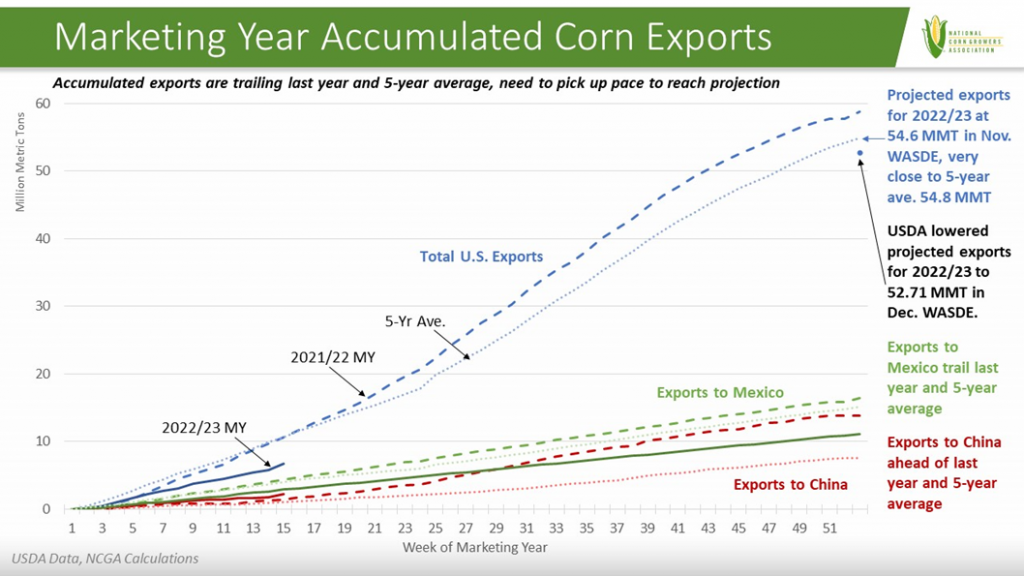 To dig into USDA’s assessment of slow sales, here is a look at corn export sales so far this marketing year. With data through Week 14 of the marketing year, weekly exports for 2022/23 are represented by the solid blue line. Exports to date in this year are notably trailing last year and the five-year average pace represented by the blue dashed and dotted lines. The export projection of 54.6 MMT in the November WASDE was very close to the 5-year average of 54.8 MMT, providing a good illustration of a pace to hit the export target. The lower projection of 52.71 MMT in the December WASDE is still beyond current pace, but this early in the marketing year there is time for a rebound in corn exports. Exports to China in 2022/23, represented by the solid red line, are ahead of last year and the previous five-year average as shown by the dashed and dotted red lines. China’s actions early in the week to lift COVD-19 restrictions may help bolster demand for corn and other commodities that use corn.