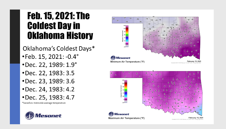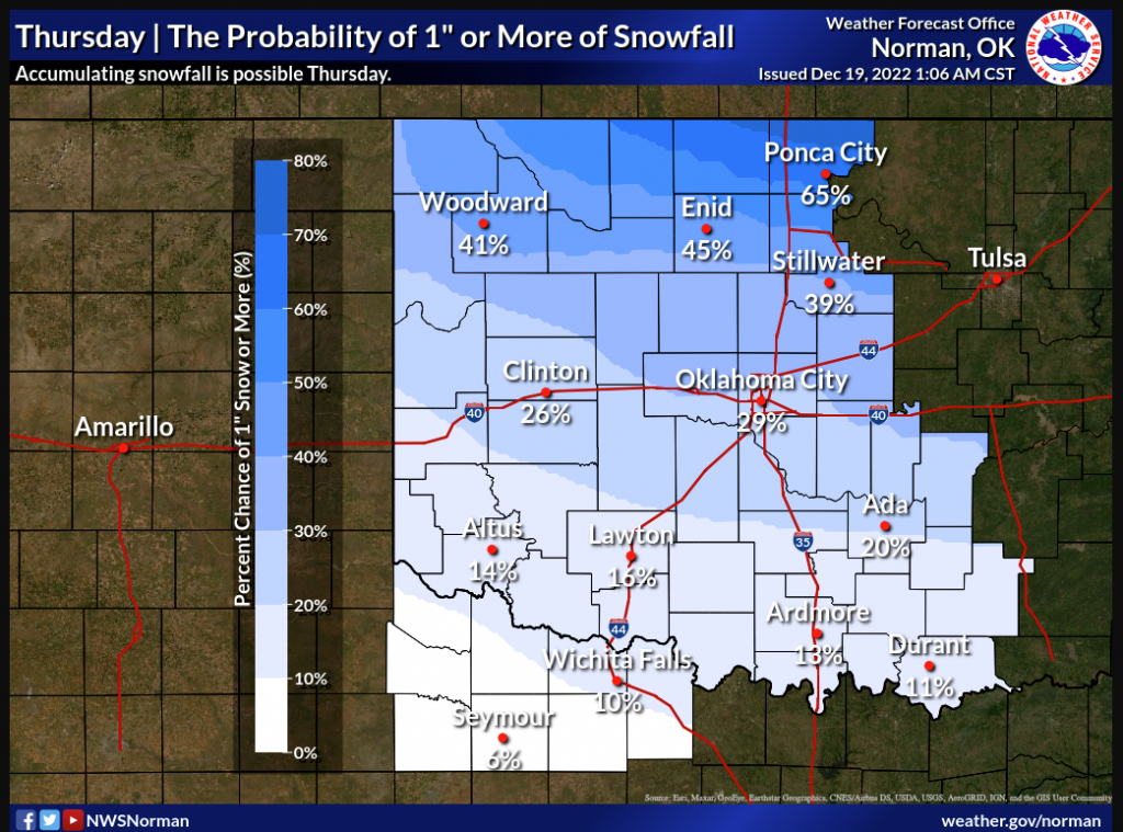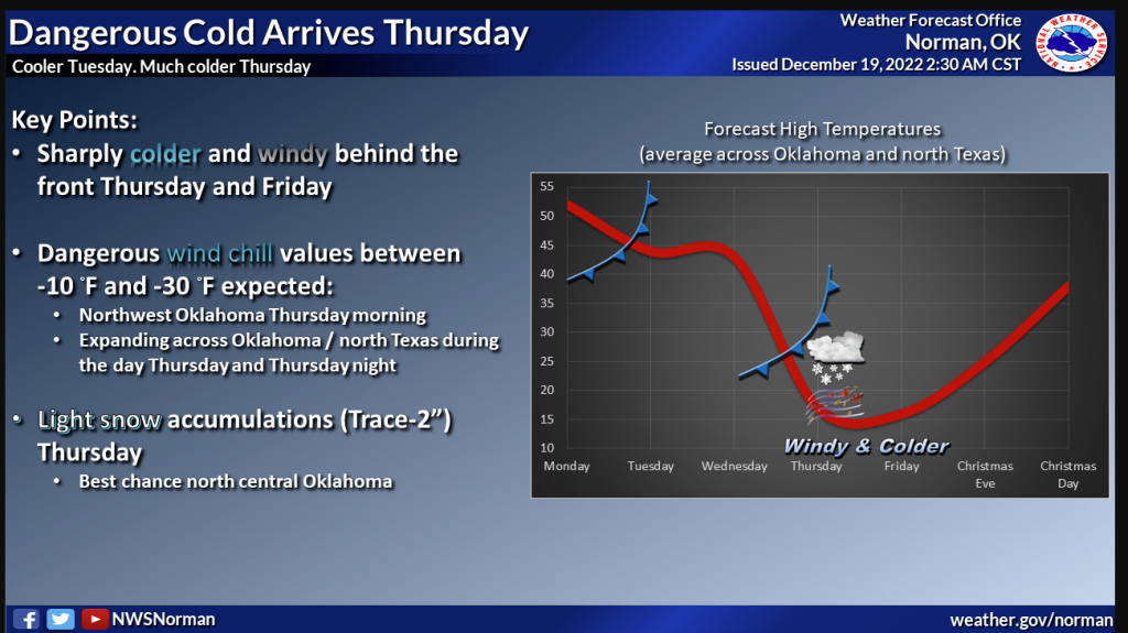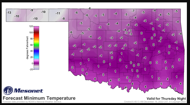 McManus says there probably won’t be much snow, “there is a bit of a chance for some accumulating snow across northern and eastern Oklahoma that could cause some travel disruptions, but any sort of travel in this type of cold with wind chills down into the -10s to -20s level will be dangerous. Even in light snow with winds blowing 30-50 mph with higher gusts, ground blizzard conditions could be experienced, which would make travel dangerous.”