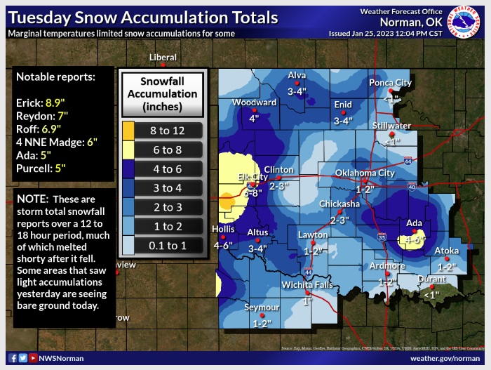 snowflakes to the size of half-dollars that fell into a near windless environment, an oddity on most days in Oklahoma. West central Oklahoma saw 6-8 inches of snow, with Erick leading the state at 8.9 inches. Locations in central