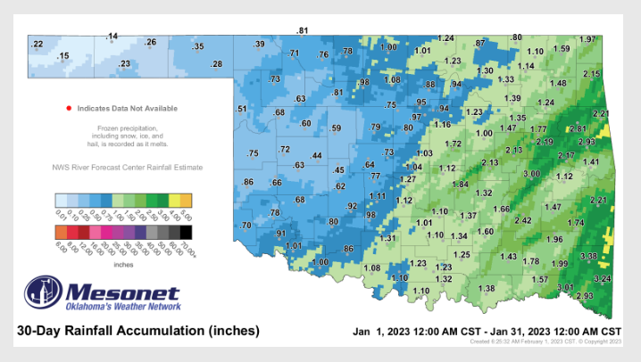 Even with the precipitation, McManus says we are still .04 inches below normal for January, as it ranked the 58th direst January since the records began back in 1895, ” Far eastern Oklahoma had the greatest totals of 3-4 inches, with a few localized areas with 4-5 inches evident on radar estimates. Much of the western half of the state ended with less than