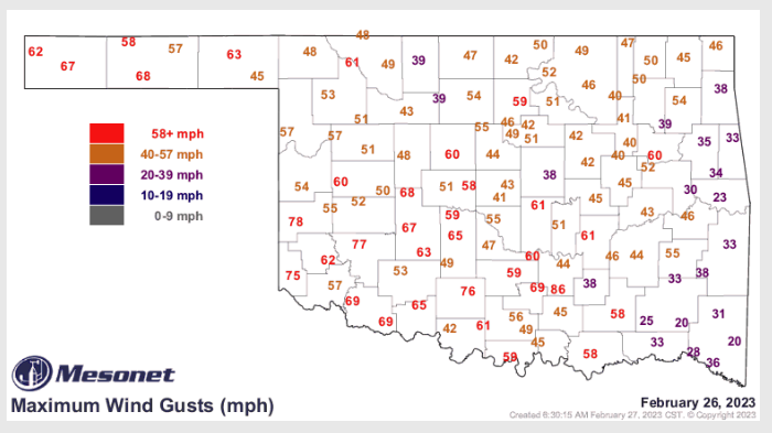 McManus says if this is a preview of whats to come, we are off to a rocky start, “Winds have calmed somewhat, but we had 59 severe wind gusts (at least 58 mph) during the last 24 hours recorded by the Mesonet, the tops of which was 86 mph at Fittstown at 10:25pm.”