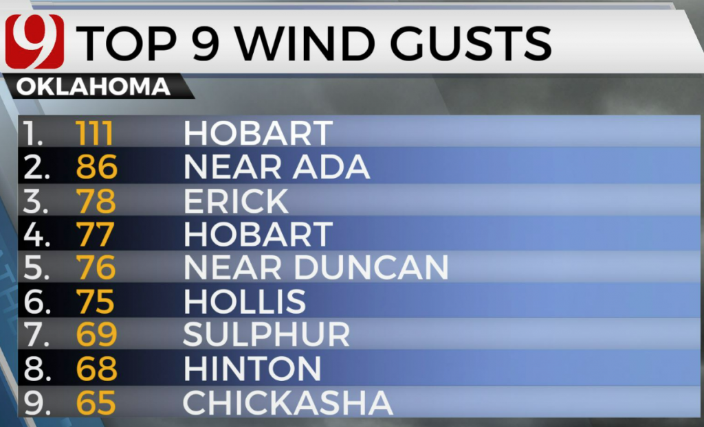According to Payne, wind gusts got up to 111 in Hobart, 86 near Ada, and even up to 65 in Chickasha. Storm damage was reported across the state, including Shawnee, where we saw Several damaged buildings. Norman also received damage with a reported EF2 Tornado with several homes impacted.