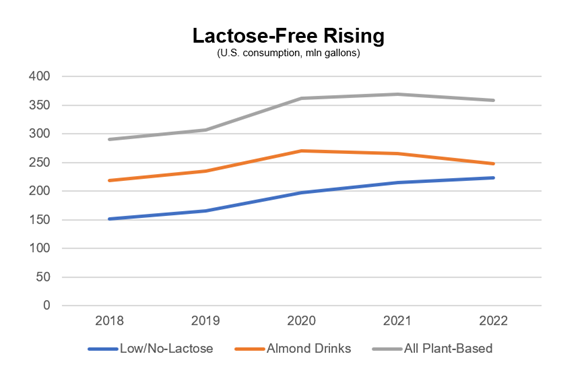 The lactose-free milk moment has arrived. To note: This year, at its current pace, lactose-free milk consumption is set to overtake almond beverages – the most popular plant-based category — in overall U.S. sales volume. Its total consumption is already more than half that of the entire plant-based sector, and it’s four times as much as oat drink, the current darling for aficionados of heavily processed, artificially colored liquids. The rise of low- and no-lactose milk comes even though Starbuck’s doesn’t serve it, many consumers unfortunately aren’t even sure that it comes from a cow, and it doesn’t get nearly the attention it deserves as a solution to lactose intolerance – because the plant-based beverage-makers who shout loudest care more about their marketing pitch and ideologies than in actual nutrition solutions.