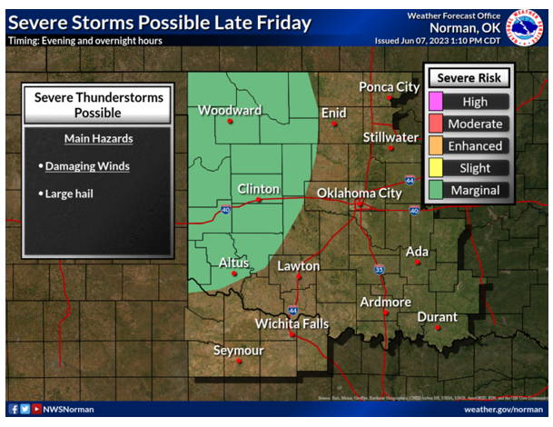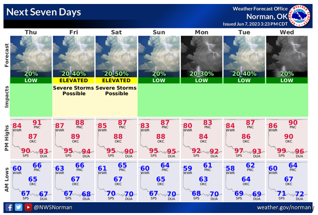 Below, see the next 7 day forecast and 3-Day Rainfall Accumulations recorded by the Oklahoma Mesonet. The next Oklahoma Harvest Report will be published on Monday, June 12, 2023, and a regional report will be published by Plains Grain Inc. on Friday, June 9, 2023