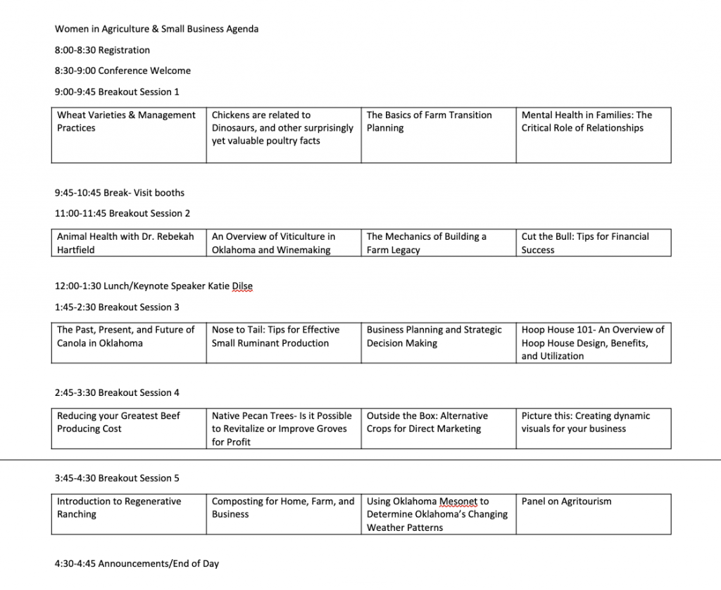 “This year’s Women in Ag Conference will be made up of five different breakout sessions,” Minyard said. “There are 20 different topics in total.”