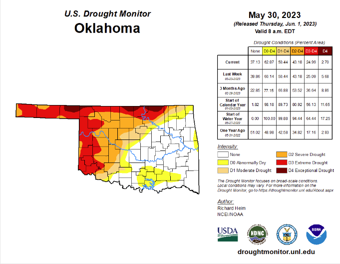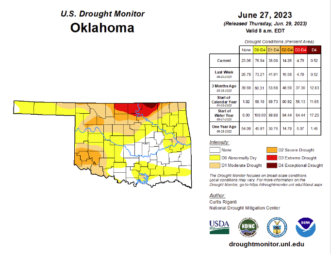 McManus says the rains we have seen across June in Western Oklahoma have reduced the drought from 50% of the state at the end of May to 36% of the state at the end of June, according to the US Drought Monitor, and the amount of drought considered at least severe dropped from 43% to 14% over that same period, “New drought areas in south-central and east central Oklahoma had emerged by the end of the month, however. The July drought outlook from the Climate Prediction Center considered additional development unlikely and more improvements possible across north central and eastern Oklahoma by the end of the month. CPC’s July temperature and precipitation outlooks showed increased odds of warmer- and wetter-than- normal conditions across the entire state.”