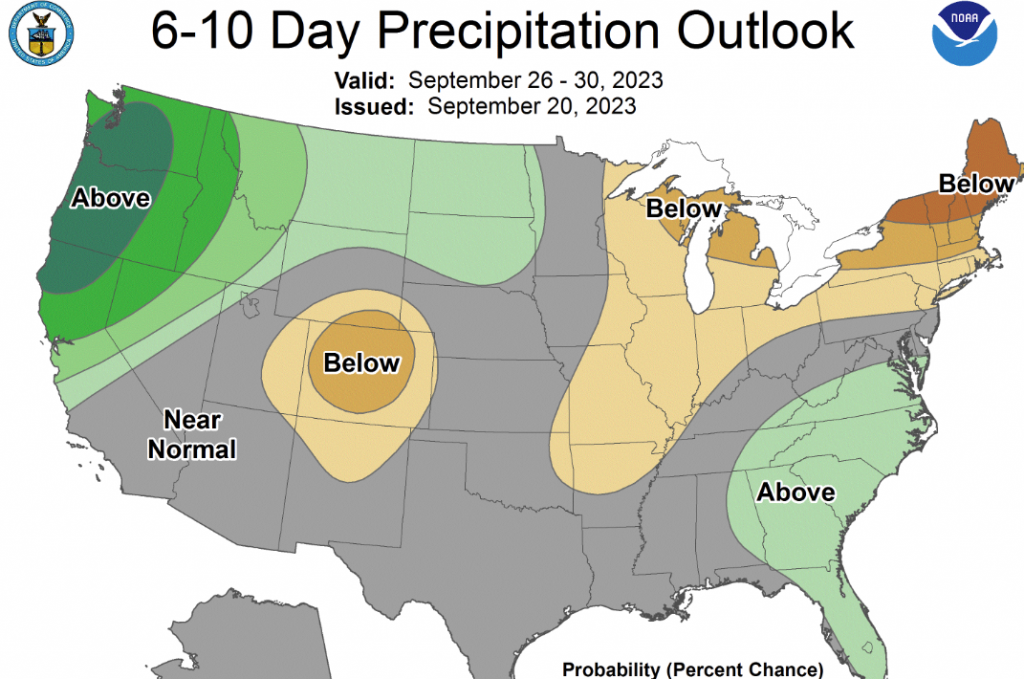 According to the National Drought Summary this week, Several Pacific weather systems moved through the jet-stream flow during this U.S. Drought Monitor (USDM) week (September 13-19). The upper-level circulation still consisted of an upper-level ridge over the western contiguous U.S. (CONUS), but it was weakened by the traversing Pacific weather systems. The ridge kept most of the western U.S. dry with warmer-than-normal temperatures from northern California to Montana. Cold fronts and surface low-pressure systems that accompanied the weather systems brought rain to the Southwest, southern Plains, Southeast, and Northeast. Heavy rain fell across western to central Texas, improving drought conditions. The rain in the East fell mostly on non-drought areas. The fronts kept temperatures cooler than normal from the Southwest to most of the southern Plains and across much of the country from the Mississippi River to East Coast – only the Gulf of Mexico coast and New England had a warmer-than-normal week. In addition to getting rain from frontal systems, parts of New England were soaked by the remnants of Hurricane Lee over the weekend. The northern Plains and parts of the central Plains, the Great Lakes, and the Mississippi and Ohio Valleys had a drier-than-normal week. The dryness this week was a continuation of dry conditions that have lasted for several months – in some cases for years – across parts of the country and that have dried out soils across more than half of the CONUS. According to U.S. Department of Agriculture statistics, 58% of the nation’s topsoil moisture and 59% of the subsoil moisture was dry or very dry. For topsoil moisture, based on data going back to 2015, this amount is second only to the drought of 2022, which peaked at 68%. The continued dry conditions resulted in expansion or intensification of drought and abnormal dryness across parts of the Mississippi and Ohio Valleys, Mid-Atlantic states, and Pacific Northwest.