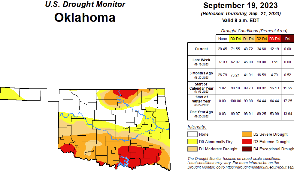 According to the latest Oklahoma Drought Monitor, Exceptional Drought remains at Zero percent, unchanged for the past few weeks.
