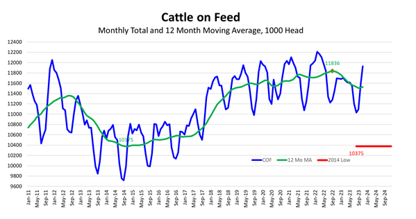 The increase in feedlot placements the past two months does not, of course, mean that cattle numbers have increased.  The estimated 2023 calf crop is down 1.9 percent from last year in addition to a 2.0 percent decree year over year in 2022.  In total, the calf crop has been getting smaller since 2018 and is down 2.5 million head, a decrease of 6.9 percent in the past five years.  Increased placements represent a change in timing as cattle are pulled forward and means that feedlot marketings and cattle slaughter will be comparatively front-loaded early in 2024.  The year over year increase in September and October placements have added about 200,000 head to feedlot inventories compared to one year ago.