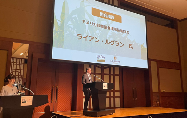 The U.S. Grains Council (USGC) recently co-hosted a conference on U.S. ethanol for sustainable aviation fuel (SAF) in Japan. Pictured, USGC President and CEO Ryan LeGrand delivered opening remarks at the event, presenting the potential for U.S. corn ethanol for SAF production.