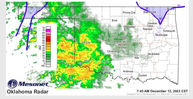 Rain Showers are currently making their way across the state which is great news for the Month of December in Oklahoma! State Climatologist Gary McManus says the storm will be moving East, and then Dive South and the Rainfall pattern will mirror that movement, “We do have some pretty good totals thus far across far Western OK, especially for December.”