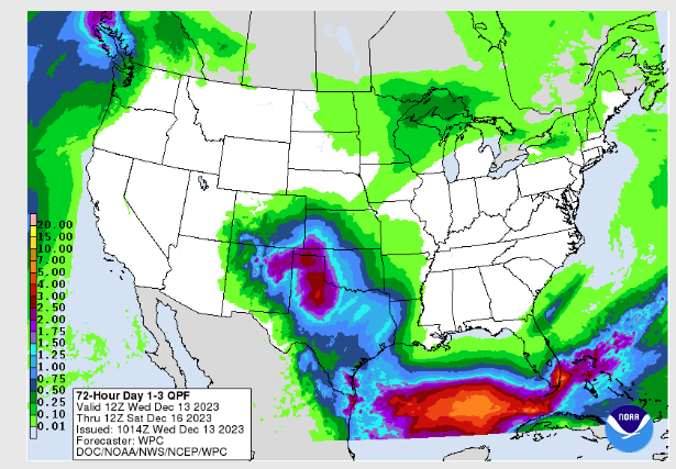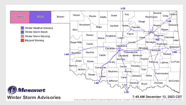 While the December Rain is much needed across Oklahoma, McManus says that most of the state probably won’t see snow for a White Christmas this year, “Now about that snow…you ain’t getting any. At least most of you. But we do have a winter storm warning for Cimarron County and a traveler’s advisory for Texas County, where we could see totals ranging from about 6 inches to the west to around an inch or so to the east.”