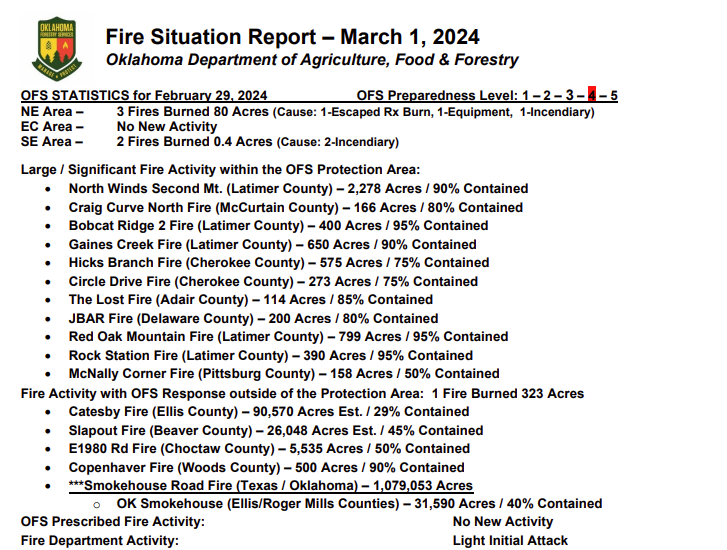 yesterday to continue securing control lines on the significant fires in western Oklahoma while OFS was able to declare controlled status on a number of the large fires that had plagued eastern Oklahoma in recent days. Precipitation over a large part of Oklahoma was welcomed although only scant amounts were realized on the western Oklahoma fires while most of the Panhandle received nil. Wetting amounts, or near wetting amounts, in areas of central and southeastern Oklahoma will serve to enhance some of the early green up. Fire danger concerns will be focused on western Oklahoma in the coming days as the dryline flexes deeper into the state each day through the weekend ahead of a weak