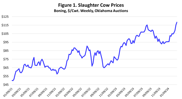 Slaughter cow prices continue to move higher with declining cow inventories and reduced cow slaughter. Boning cow prices in Oklahoma auctions averaged $118.54/cwt. (average dressing) for the week ending March 8, 2024 (Figure 1). Slaughter cow prices for the week ranged from $126.87/cwt. for high dressing breaking cows to $99.13/cwt. for low dressing lean cows.