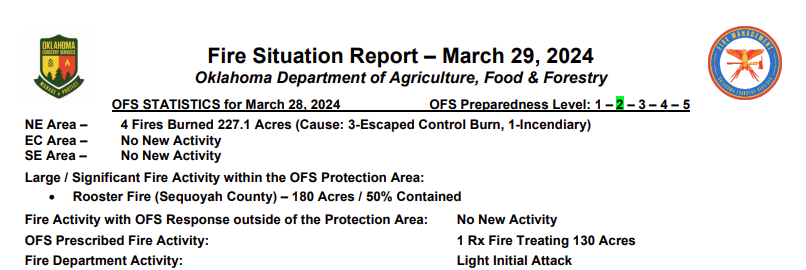 Statewide Discussion: Southwest winds will increase today following a drying day yesterday. Several controlled burns/prescribed fires occurred yesterday that will merit thorough mop-up and patrol limiting escape potential as winds increase through the day. A Red Flag warning is in effect today in Cimarron County as dry air flexes into the Panhandle. Today will have the highest concern through the Easter Weekend with dry air moving across the Panhandle counties each afternoon generally stalling along the OK/TX state line at the 100th Meridian. Dry conditions will persist through the weekend with diurnal burning periods. Increasing initial attack activity is expected with emergence of some large wildfires (>300 acres) although significant wildfire occurrence appears to be limited.