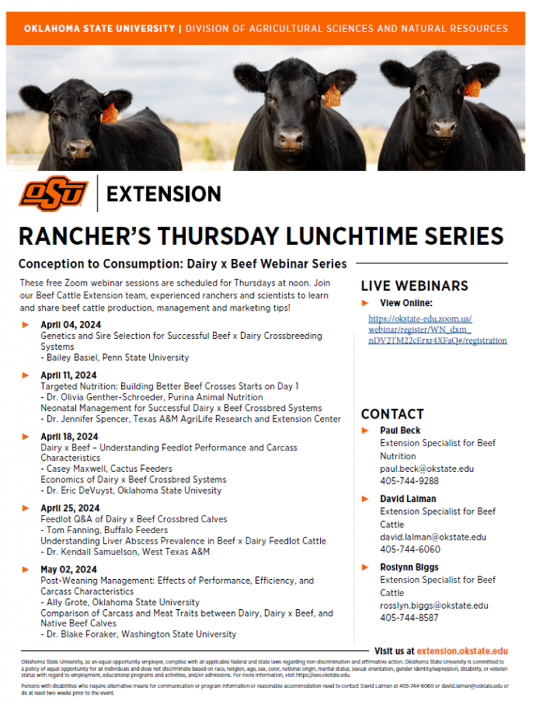 Recordings of past webinars are available at https://extension.okstate.edu/programs/beef-extension/ranchers-thursday-lunchtime-series/conception-to-consumption-dairy-x-beef.html