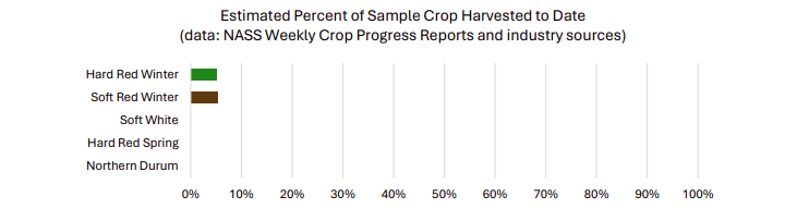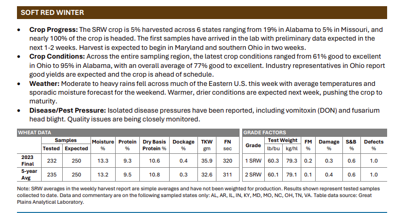 HRW samples arrived at the lab this week for analysis. SRW harvest is also slowly progressing due to rain delays; the