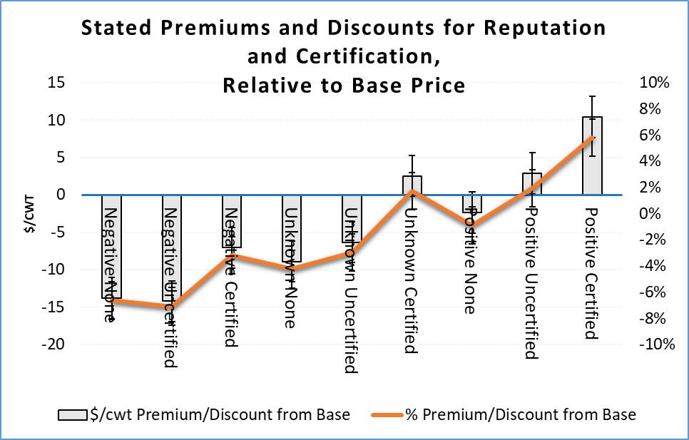 While the market value of seller reputation in cattle markets is considered to be a key component of the price paid by the buyer, it is elusive to measure in standard auction data. Boline (2016) interviewed cattle buyers on-site at livestock auctions and found that reputation does matter, but also that third-party verification can act as a proxy for reputation (Figure 1). Cattle buyers were willing to pay similar premiums, on average, for certified cattle with an unknown reputation ($2.52/cwt) and uncertified cattle with a positive reputation ($2.86/cwt). Certified cattle from a reputation seller averaged $10.42/cwt in stated premiums. It is also important to note that negative reputations were discounted more heavily than positive reputations were rewarded and that even certified cattle from a seller with a negative reputation were still discounted quite heavily. For cattle with an unknown reputation, only 2% would not consider those cattle if certified, but if cattle were uncertified, 9% of buyers would not consider purchasing them. However, 25% of buyers would not consider purchasing cattle with a negative reputation, regardless of certification.