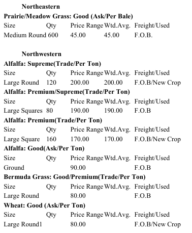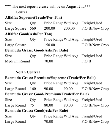 The hay trade is at a standstill due to slow demand. Due to an excessive supply of hay from 2023, new crop hay continues to be baled and rain showers continue to cover the state during the summer.