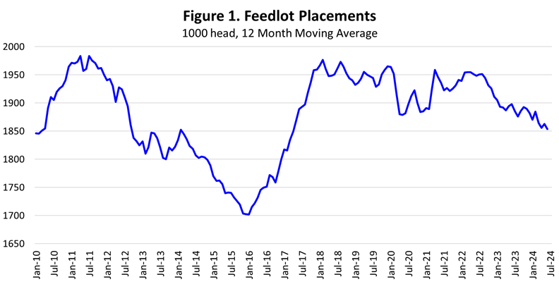 June feedlot placements were 91.2 percent of last year, slightly less than average pre-report expectations. The placement total was the smallest June total since 2016. Although the feedlot inventory has been slow to decrease, feedlots have been placing fewer cattle as feeder supplies have dwindled in recent years. The total U.S. calf crop peaked in 2018 in the most recent cattle cycle and has been declining each of the past five years. The 2024 calf crop is estimated to be another 1.5 percent smaller year over year leading to a total decline since 2018 of 8.9 percent or 3.2 million head. Figure 1 shows that average feedlot placements have decreased with the twelve-month moving-average for June at the lowest level since April 2017.