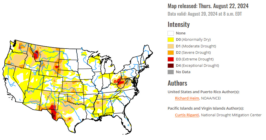 According to the latest U.S. Drought Monitor, a high-pressure ridge continued across the southern Plains during this U.S. Drought Monitor (USDM) week (August 14-20), bringing dry and very hot weather, especially to Texas. Pacific weather systems moving in the jet-stream flow brought above-normal precipitation to parts of the West Coast, the northern to central Rockies, and parts of the central to northern Plains, the Midwest, and Northeast. The rain was frequently hit-or-miss, with large parts of the Pacific Northwest to Plains, and Midwest to Northeast, receiving little to no precipitation. In addition, much of the Southwest, and southern Plains to Southeast, were drier than normal this week. An upper-level trough kept the Far West cooler than normal, while a large cold front brought cooler-than-normal temperatures to much of the Midwest to East Coast. The rain contracted drought and abnormal dryness in parts of the Rockies to central Plains, and a few parts of the Midwest and East Coast. But drought or abnormal dryness expanded or intensified in parts of the West that missed out on the precipitation, parts of the Great Plains, from the Tennessee Valley to central Gulf of Mexico coast, and parts of the Midwest to central Appalachians. The lack of rain continued to dry out soils across large parts of the West (especially the Pacific Northwest), in the southern Plains, the Lower Mississippi Valley, and central Appalachians. Numerous wildfires were burning across the West with some sparking up in the southern Plains and western High Plains. The most severe drought areas included the central Appalachians to Upper Ohio River Valley, the Rio Grande River Valley, eastern Wyoming, western Montana, and central Washington.