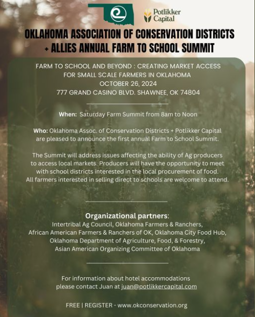 The Oklahoma Association of Conservation Districts and Potlikker Capital are pleased to announce the first annual Farm to School Summit in Shawnee, OK!