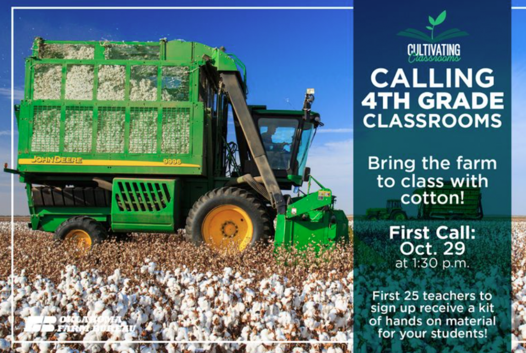 Calling all 4th grade classrooms! On Oct. 29, bring the farm directly to the classroom with Cultivating Classrooms; an OKFB Foundation for Agriculture program. Through Zoom we will invite your students to engage with a farmer or rancher and learn about Oklahoma Agriculture.