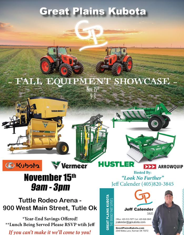If you would like to see all Kubota has to offer, join us in Tuttle on November 15th for the Fall Equipment Showcase! Jeff Calender will be on hand to discuss all things Kubota and help you find the right equipment for your farm or ranch!