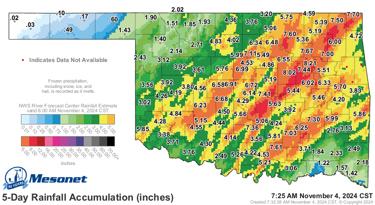 Data from the Oklahoma Mesonet shows that Stillwater, Oklahoma received 2.36 inches of rain on August 11, 2024. For the next 78 days, a total of 0.92 inches of rain fell with only one day receiving more than 0.2 inches and 72 days with zero precipitation. Starting October 30, Stillwater received 5.49 inches of rain in 5 days (Figure 1), with additional rain falling at the time of writing. Figure 1 confirms that the majority of Oklahoma received significant rain in this period. As is frequently the case in Oklahoma, the much-needed rain arrived in the form of severe storms with several tornados, leaving a trail of damage in several communities.
