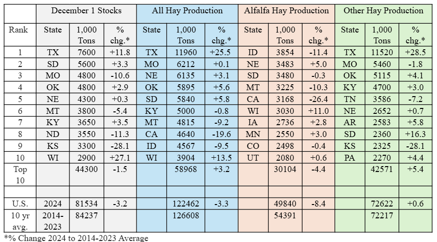 Table 1. December 1 Hay Stocks, All Hay, Alfalfa Hay, and Other Hay Production, Top Ten States and U.S., 2024 and 2014-2023 Average.